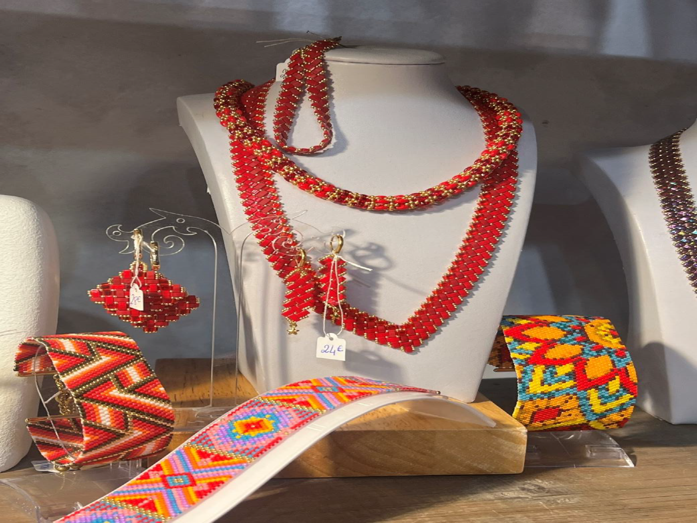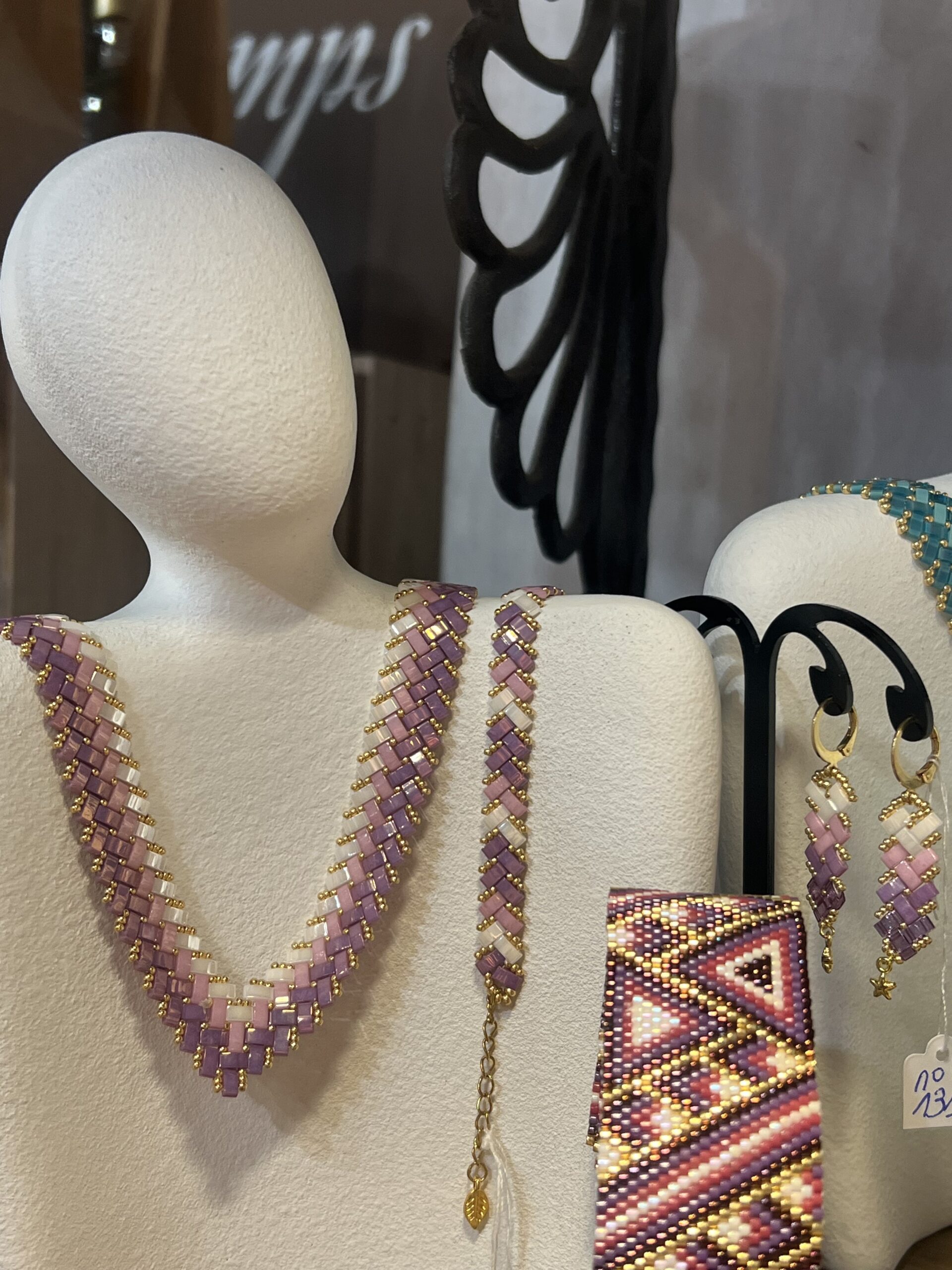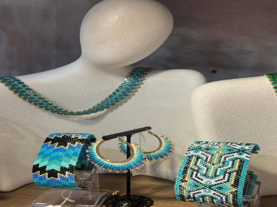 Dans son atelier, un univers de perles, de couleurs et de patience, elle compose chaque bijou comme un tableau miniature, une oeuvre d’art tissée à la main.