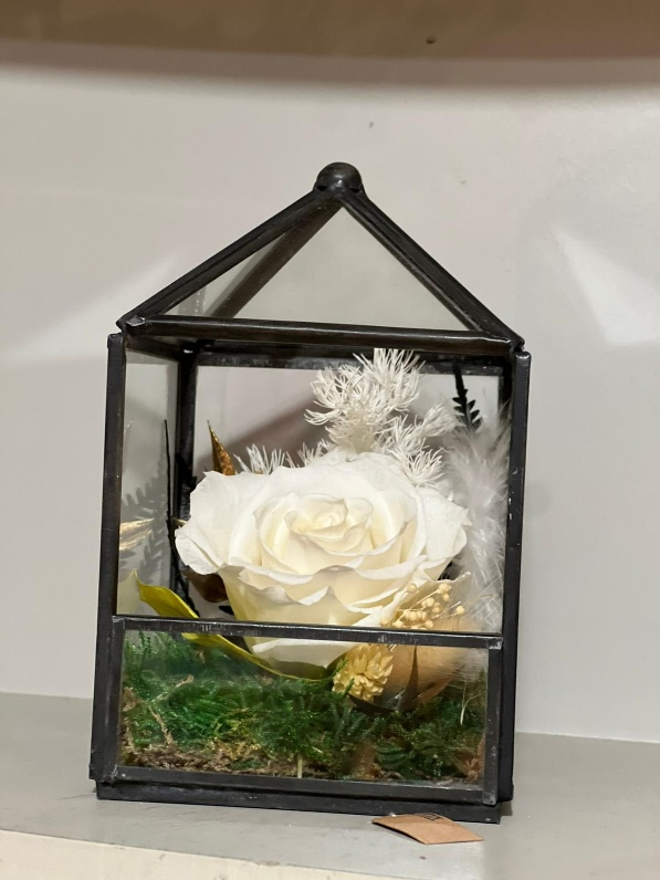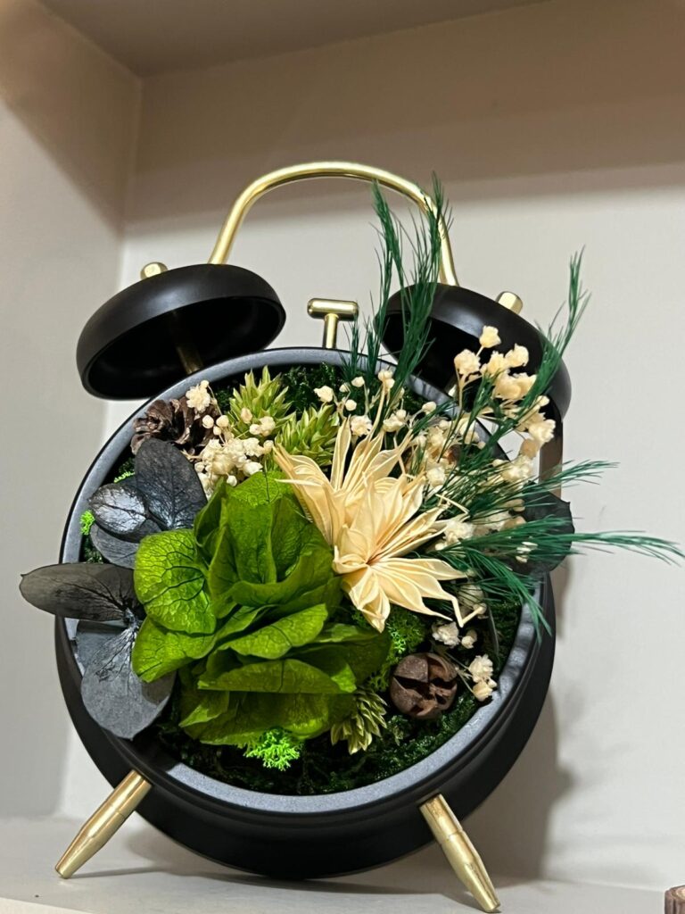 Dans son atelier baigné de lumière, elle compose des tableaux fleuris, des vases délicats, des cloches poétiques et même des réveils revisités — autant de créations où la nature se fige sans jamais perdre son âme.
